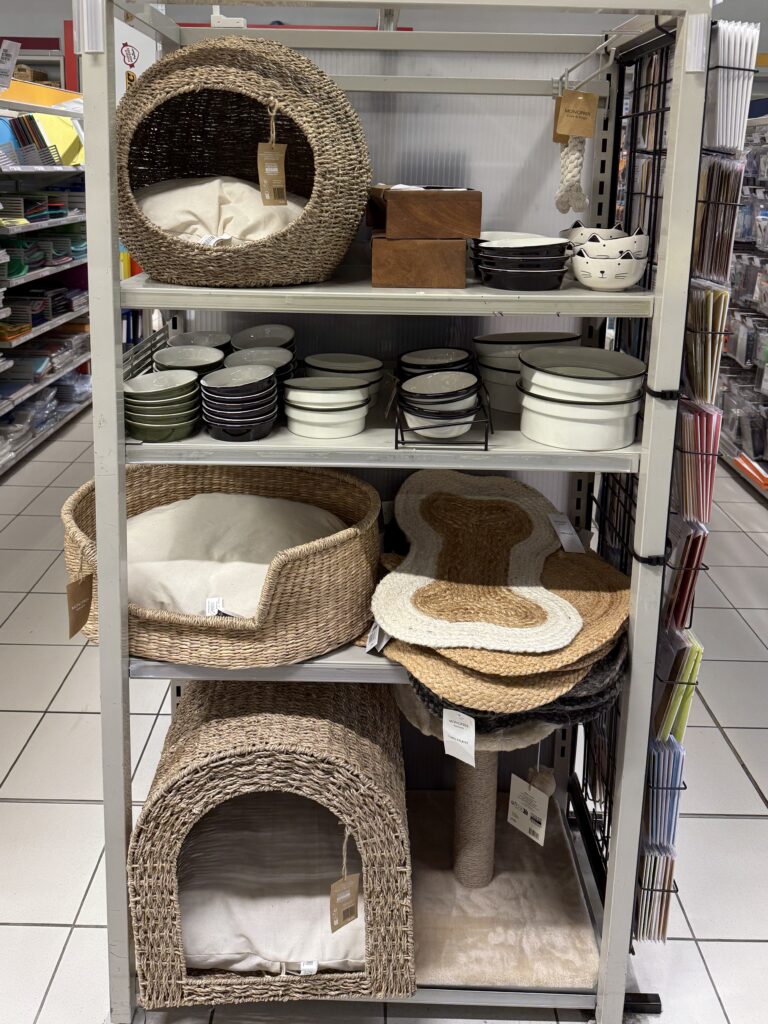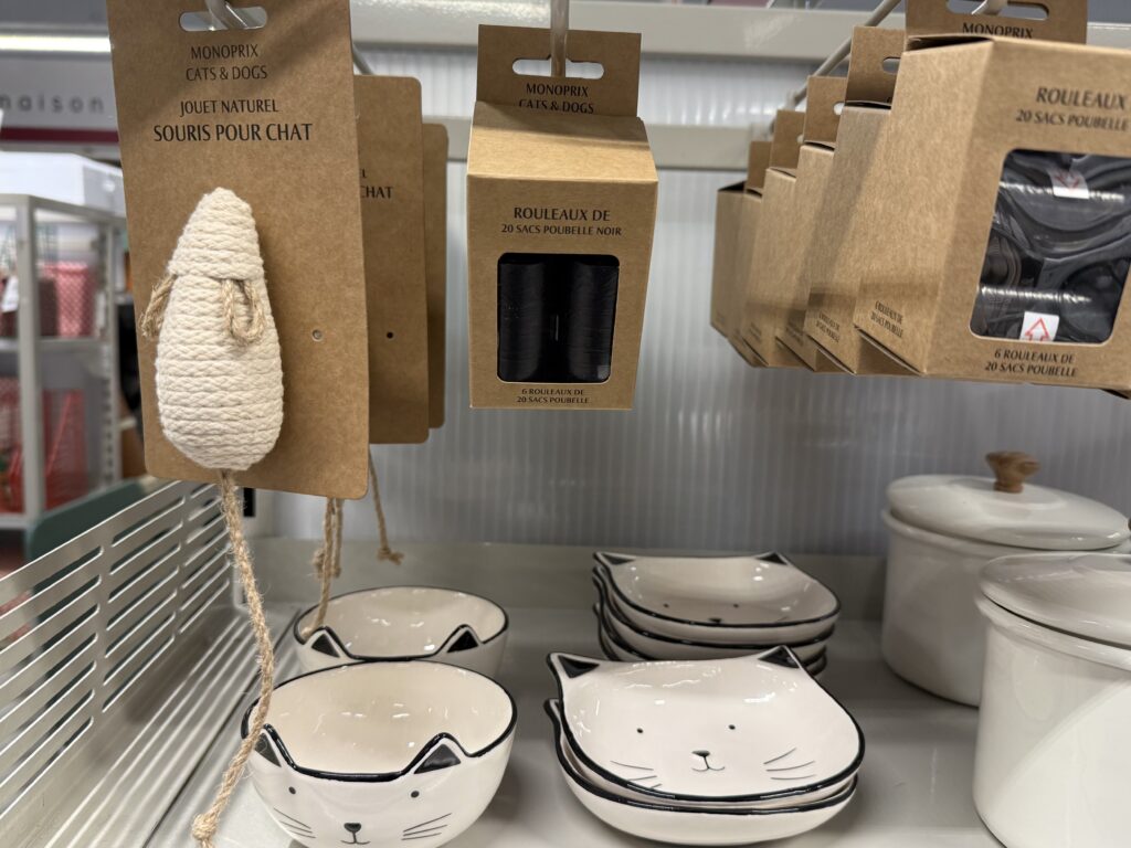 MONOPRIXには、ペット用品コーナーがあります。店舗によって品数に違いがありますが、ここは、パリ近郊の大きめの店舗で充実していました。