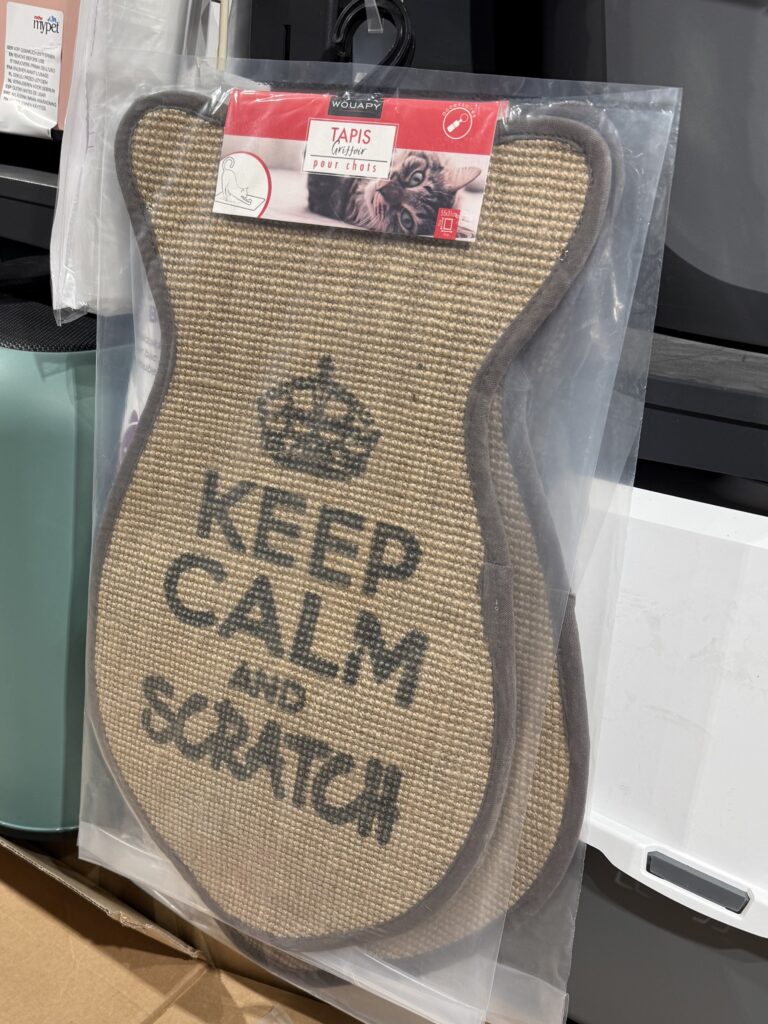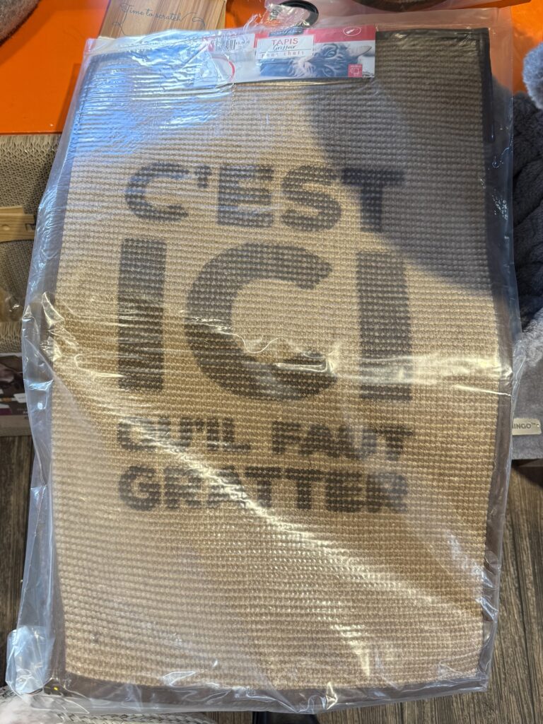 パリのペット用品店で、探した爪とぎは「ダンボール」タイプが多いなか見つけた麻マット。