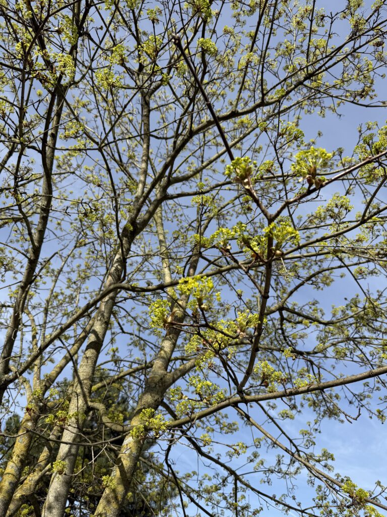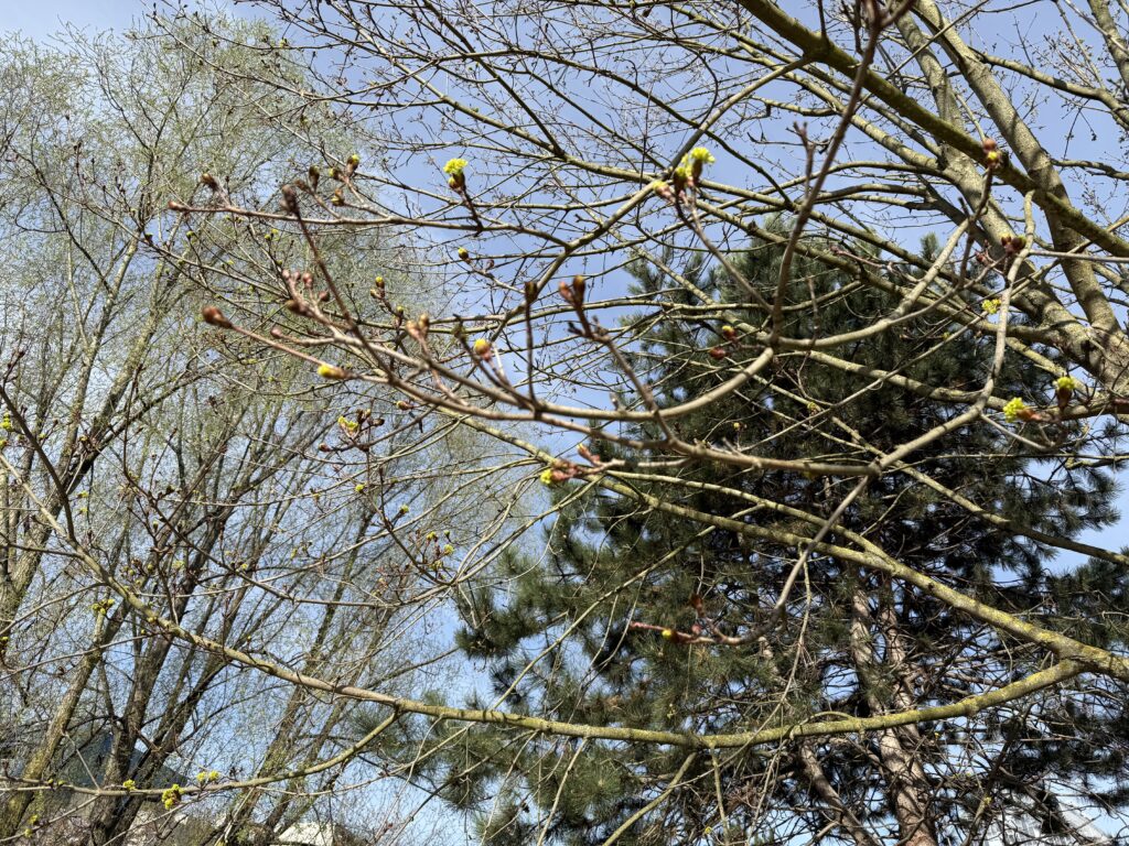 公園の木々も小さな新芽が顔を出してきました。ほんの細やかな変化ですが、寒かった冬もすっかり過去になり、春に向かっていく明るい光。青い空の美しさも元気のパワーになっています。