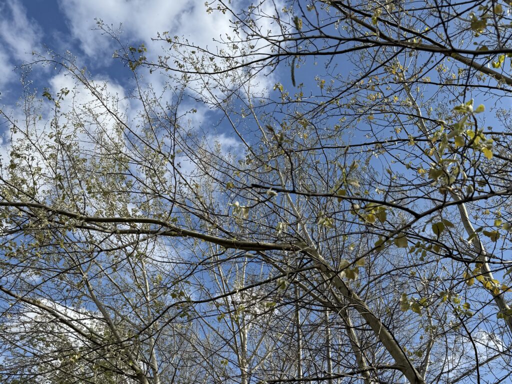 雨は大降りではなく、小雨が降ったり止んだり、そして雨上がりの空を見上げると、雲の間から光がさして春の柔らかい日差しが降りそそぎ、樹々もきらっと輝いています。